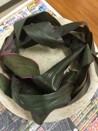 リース状にセットしたオアシスにドラセナの葉でくるくると動きをつけます。