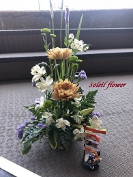 花菖蒲、大輪の1輪マム、鉄砲百合…